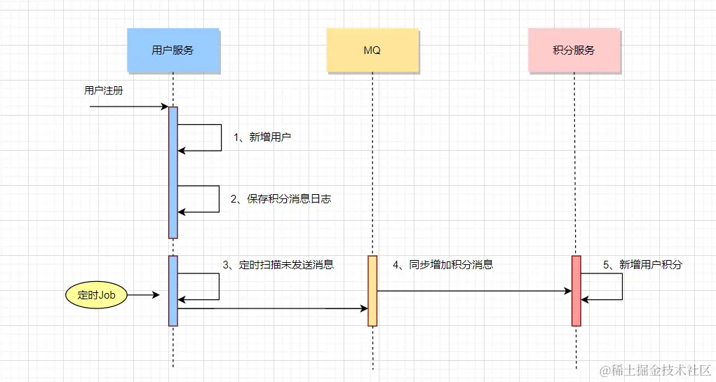 还是以上一节注册用户送积分的业务场景,介绍本地事务消息表方案。 交互流程如下: