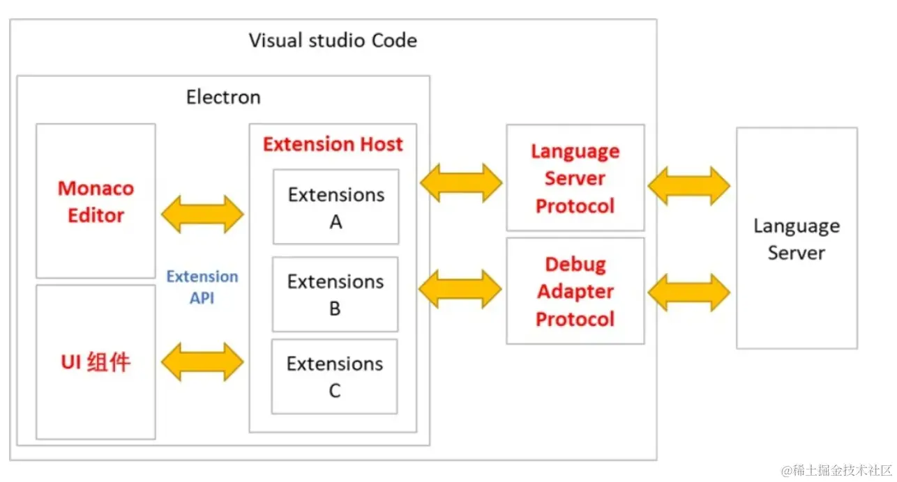 VS code 底层也是通过 Monaco Editor + 各种 UI 组件实现的, 各项能力拓展依托于各有特色的插件,而插件的能力往往也是通过 LSP 或 DAP 与 Language Server 完成通讯的。