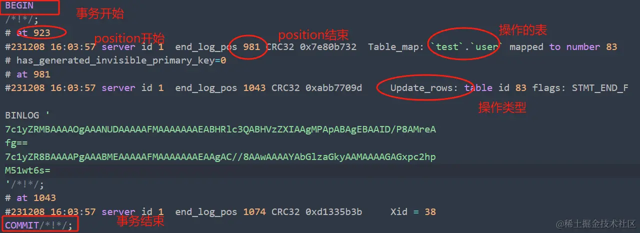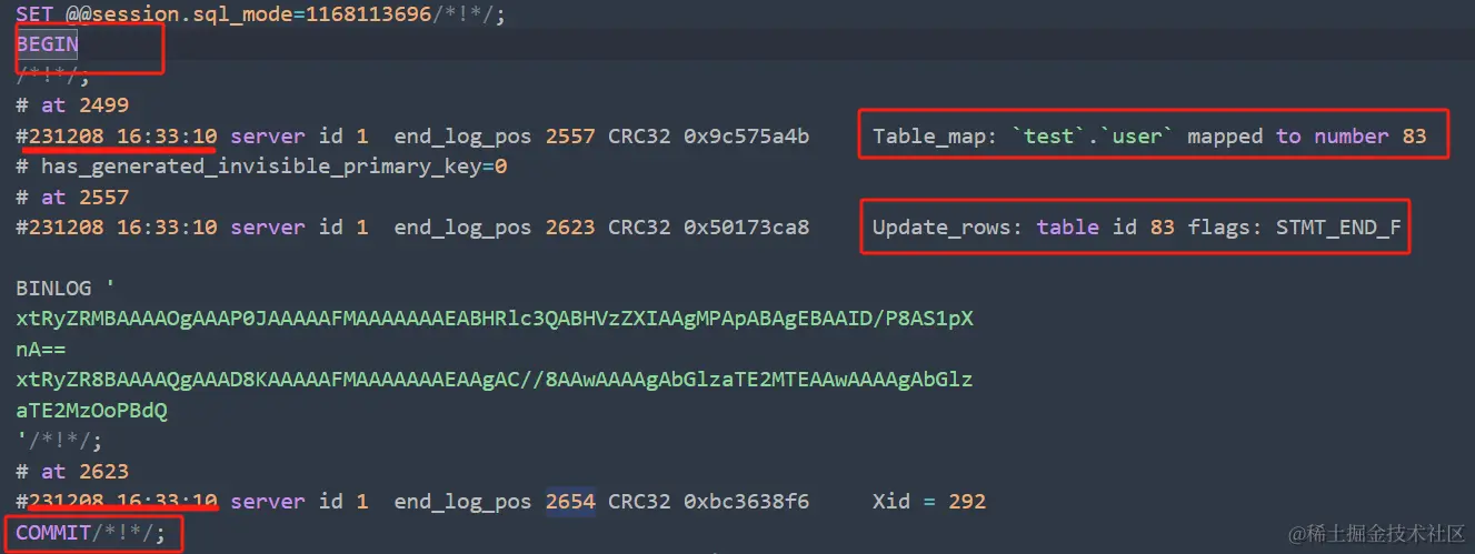 以上示例中包含了一个事务,其中有一个表映射事件(Table_map)和更新行事件(Update_rows)。二进制日志的语法结构包括事务开始、事件头、具体事件内容(如表映射、更新行等),以及事务提交。每个事件都有特定的注释信息,描述了事件类型、时间戳、服务器ID、binlog事件的起始位置等。在这个例子中,更新行事件包含了更新表test.user的行的数据。
