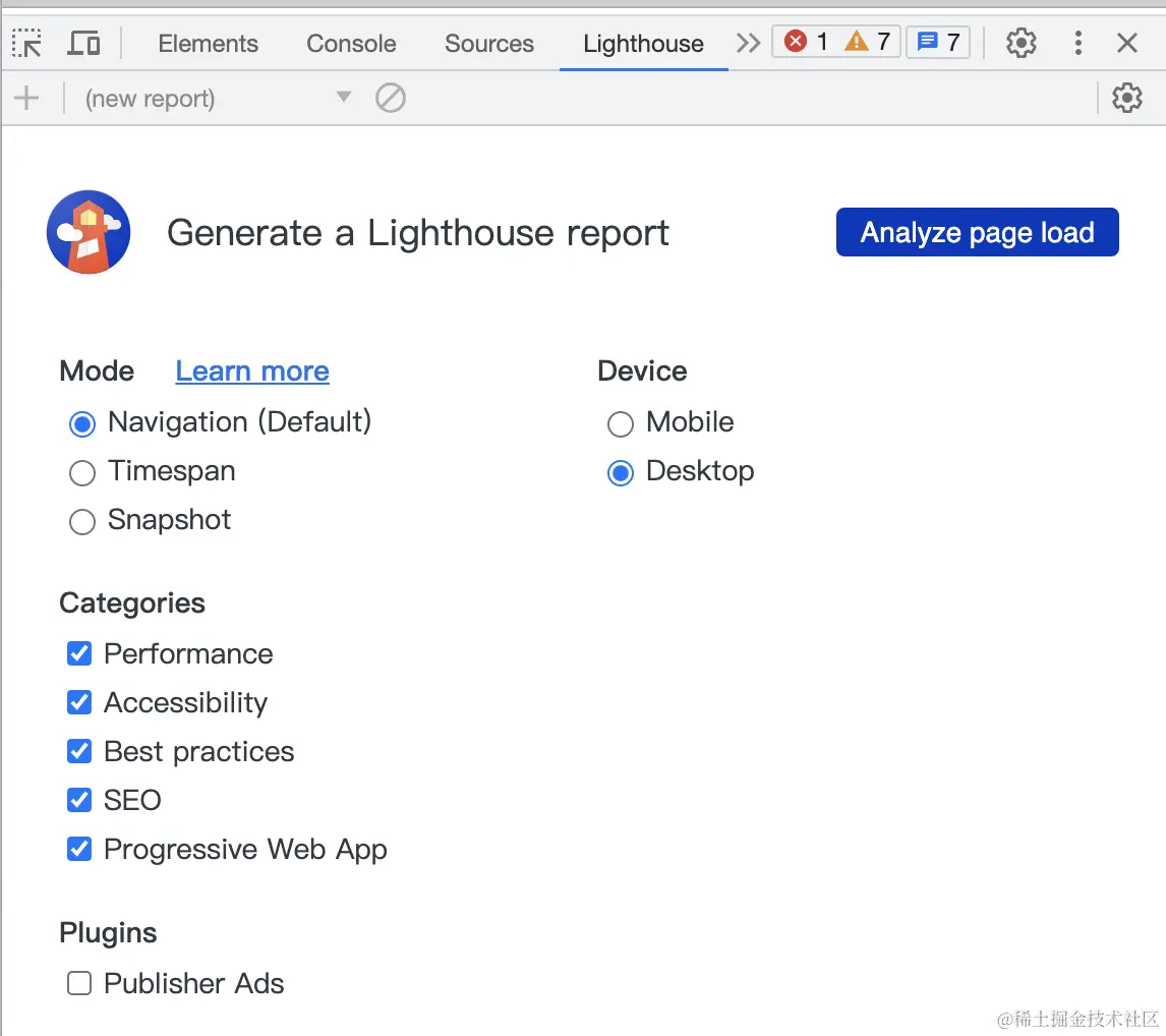 2.使用lighthouse在本地分别分析两个页面的性能(点击analyze page load按钮即可触发检测,为保证整体性能偏向真实场景,推荐大家在检测中进行一些当前页面的常规操作)