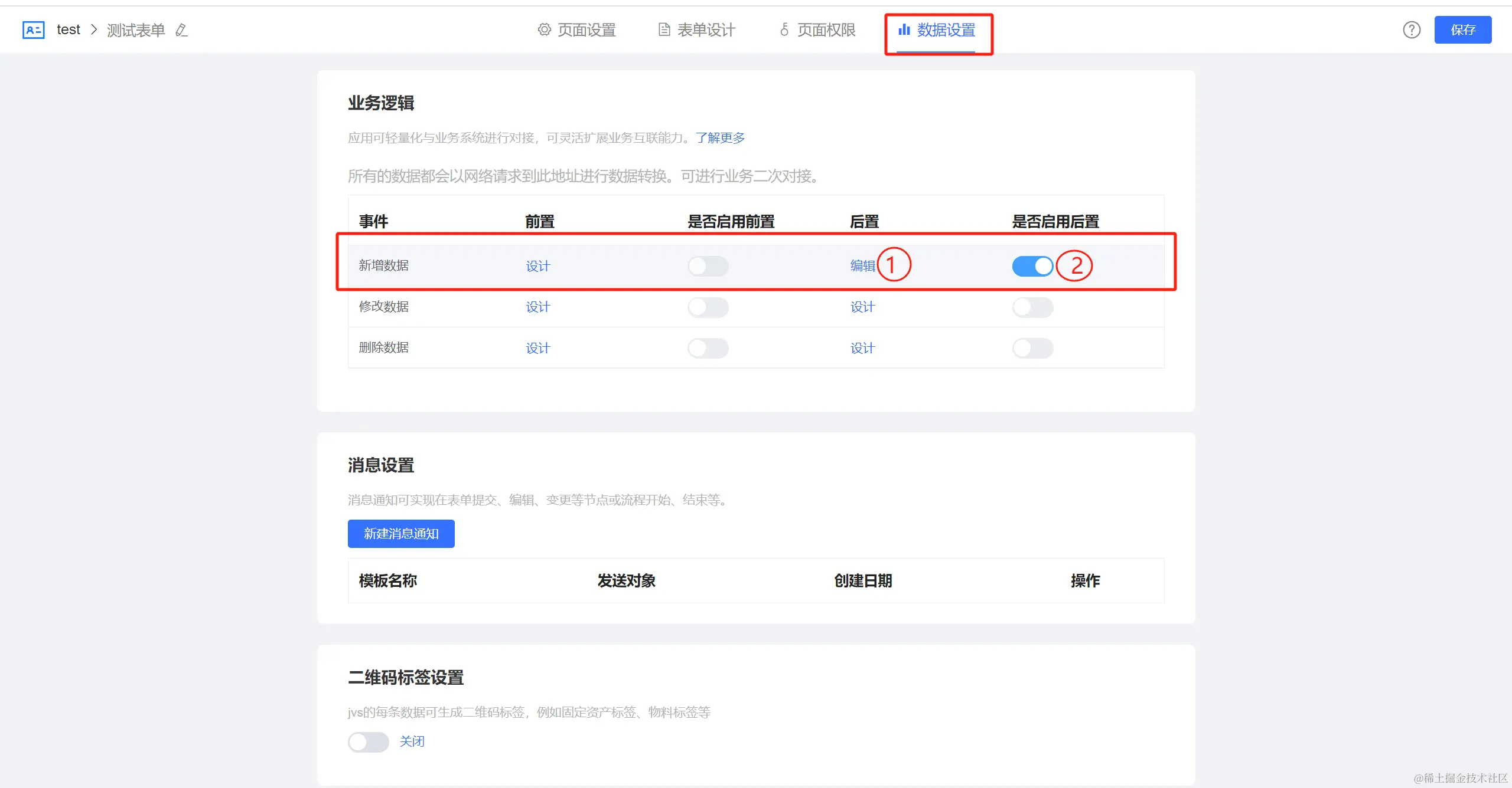 ②:开启后置逻辑的开关,这样这个逻辑就可以实现新增表单数据提交后,触发设计的逻辑。
