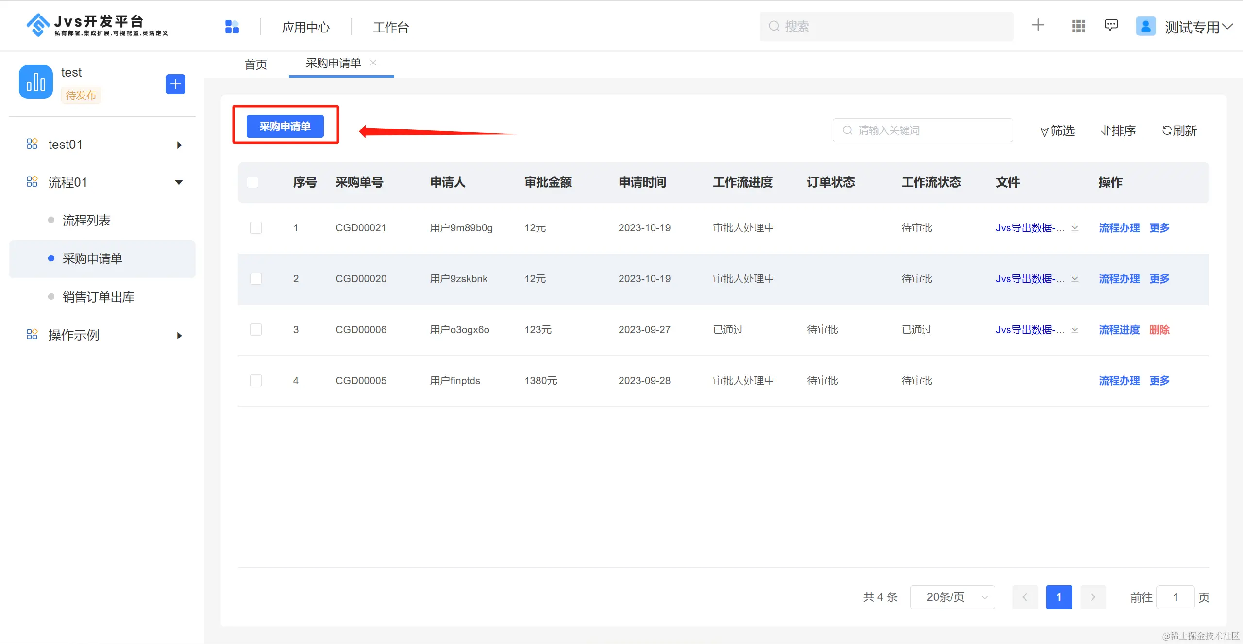 示例:通过列表页顶部的【新增】按钮提交后置事件触发流程启用。