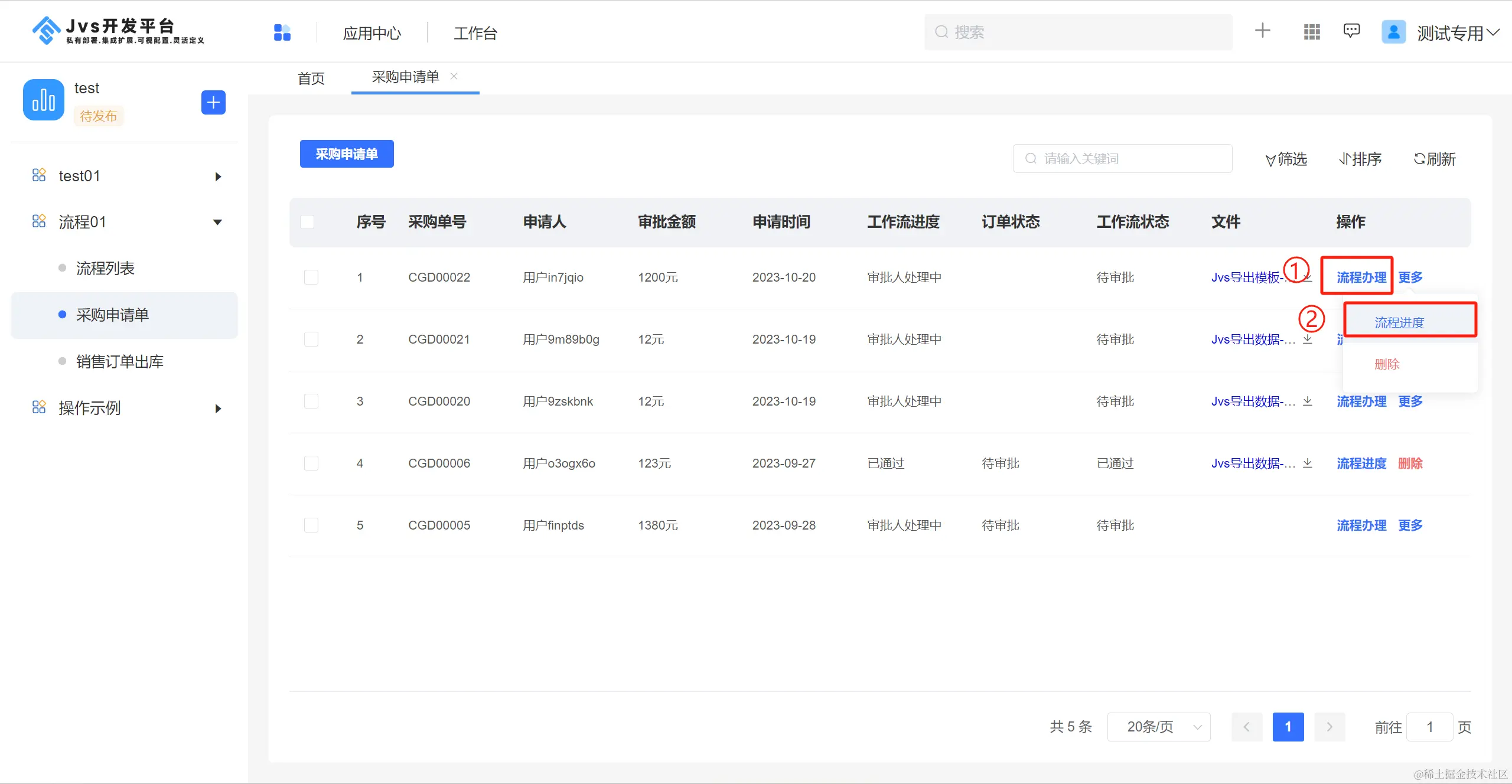 ②、选择对应流程,这里将会展示本应用中所有的流程,实现触发流程的绑定;