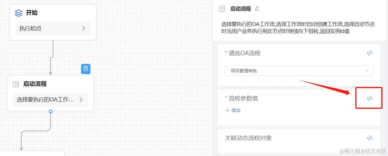 ①、拖入启动流程节点,通过启动流程节点,可以实现逻辑执行到本节点时,触发右侧选中的流程;