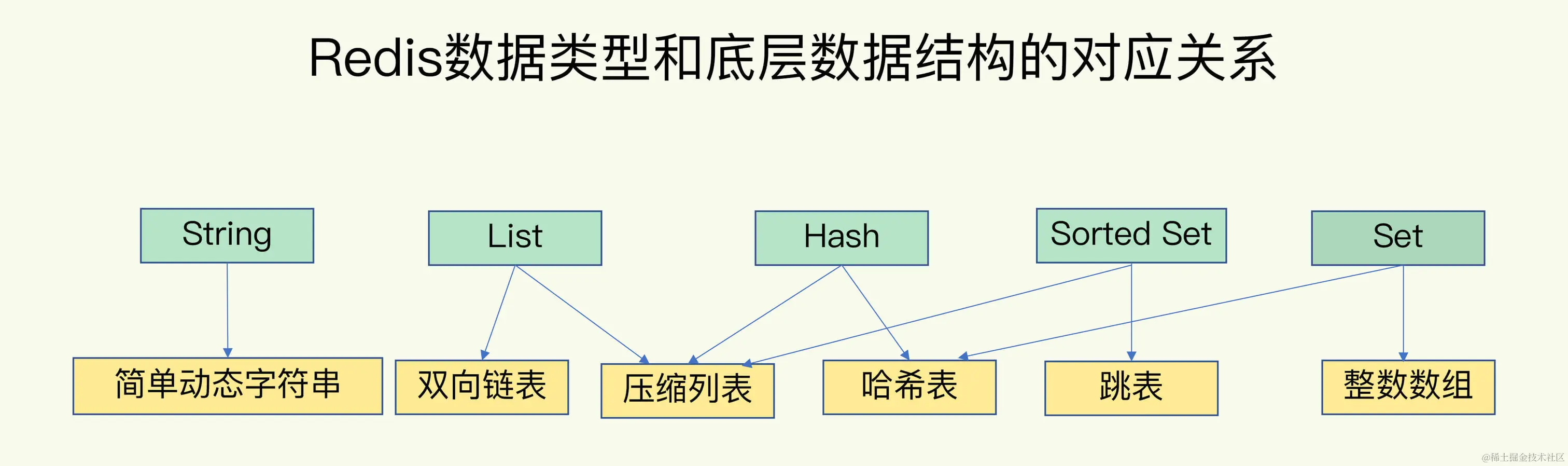 可以看到,String 类型的底层实现只有一种数据结构,也就是简单动态字符串。而 List、Hash、Set 和 Sorted Set 这四种数据类型,都有两种底层实现结构。通常情况下,我们会把这四种类型称为集合类型,它们的特点是一个键对应了一个集合的数据