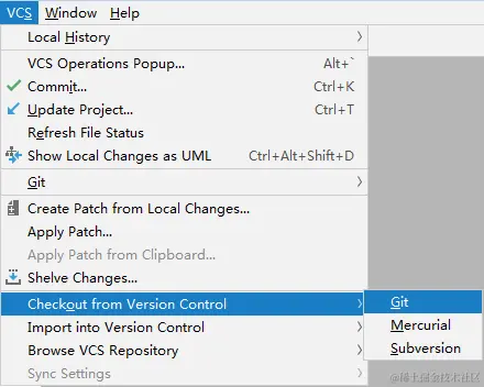 首次检出需要在 IDEA 顶部工具栏选择VCS--->Checkout from Version Control--->Git。