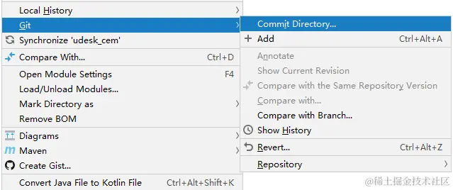 首先进行Commit操作,在项目上右键--->Git--->Commit--->Directory...,可以在弹出界面查看本次提交的文件,可以添加提交信息,还可以在右下角选择提交选项。默认是Commit,也就是只提交到开发分支的本地仓库,还有一个选项是Commit And Push...表示会将Commit操作和Push操作连起来,在Commit完毕后会接着提示你进行Push操作,也就是推送到开发分支的远端仓库。