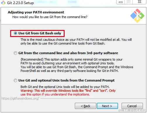 接着就是安装了,一直点击Next即可,使用默认安装。这个页面选择git使用的命令行,建议使用第一个git自带的即可。