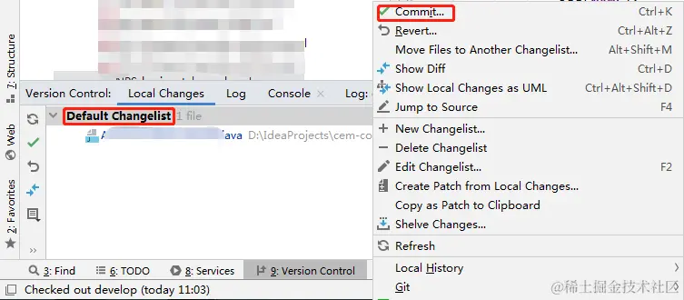 也可以在IDEA下方选项卡Version Control的Local Changes菜单下选中要提交的文件进行Commit,也可以右键Default Changelist,选择Commit)