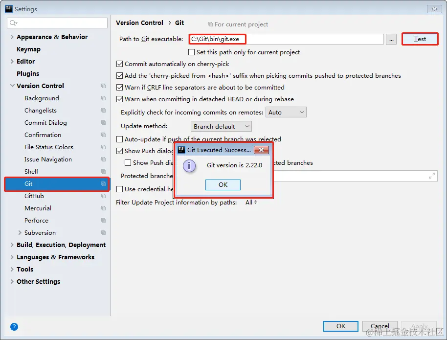 使用的IDEA版本为2019.2,首先需要在本地安装Git软件,然后在Settings选项中配置Git安装路径,点击Test进行测试。