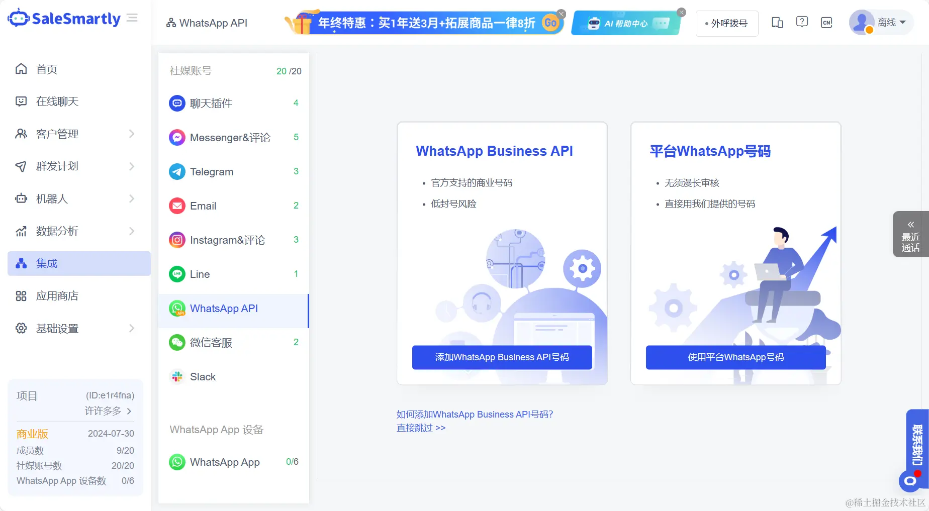 不同于免费的WhatsApp Business,WhatsApp API是无法直接从App Store 或Google Play 下载,而是需要从对接官方连接API。需要打开SaleSmartly后台找到“集成-WhatsApp API”页面,点击“添加WhatsApp Business API号码”按钮。然后将API Key填入系统中即可完成接入。