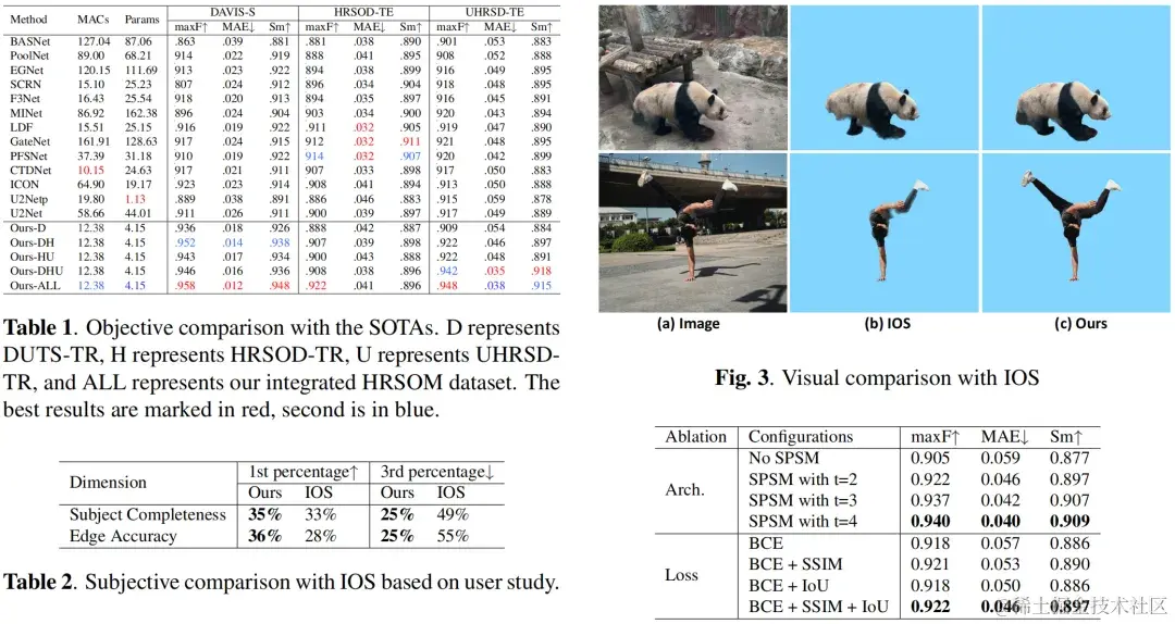在高分辨率基准数据集上,与13种SOD法相比,PSUNet具有最好的客观性能。客观评价结果优于U2Net,后者的参数值是我们网络的10倍。在骁龙8第二代移动平台上,推断一张640x640图像仅需113ms。在主观评价上,评价结果优于行业基准IOS16。