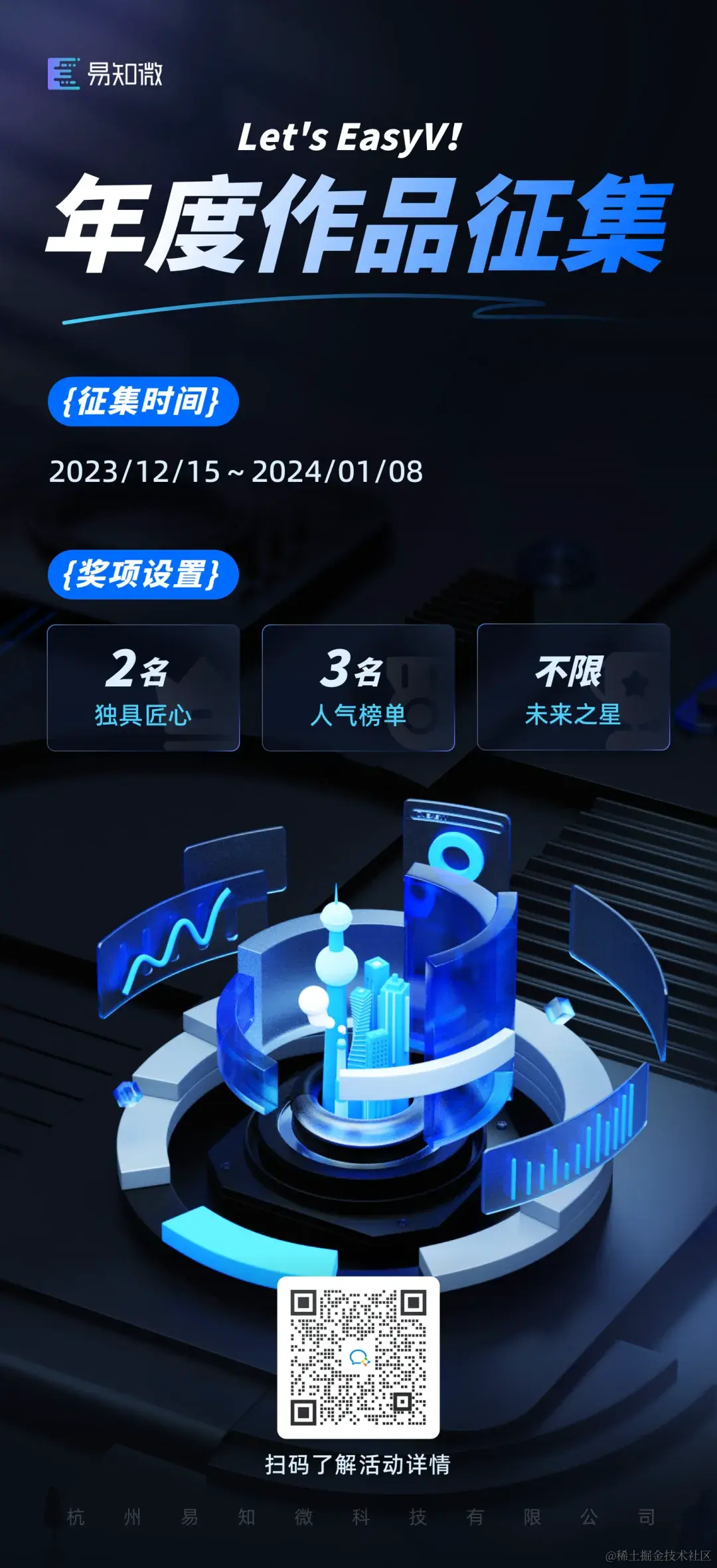 2023 年易知微年度作品征集活动正式启动,我们诚挚的邀请全体 EasyV 用户和我们一起,见证更多闪闪发光的数字孪生可视化作品,见证数字孪生可视化的无限可能!易知微希望在现在与未来持续传递数字孪生和可视化的价值,在不断提升产品能力的同时,通过设计来更好表达出数据背后的魅力,和全体用户一起,让数字孪生看见设计的力量!