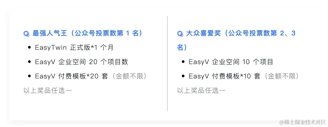 - 用户利用或包含「EasyV 数字孪生可视化搭建平台、EasyTwin 数字孪生融合渲染引擎、EasyV for Unreal数字孪生双向通信插件」制作完成的相关项目作品进行投稿即可,不限制作品细分内容。