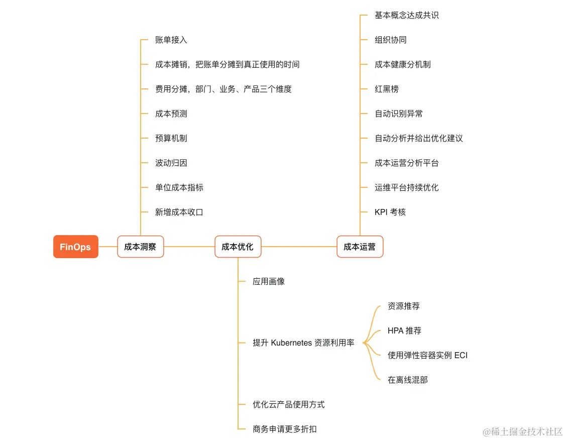 为了让大家对FinOps落地有个更直观的感受,可以先看下下面这张图,我们从成本洞察、成本优化、成本运营这三个大的方向出发,这也符合FinOps的原则。当然本篇文章,我不可能把以下每个节点都讲的那么清晰,我会更多的是讲一些我的思考带给大家。这里的每个节点如果要讲,绝对可以单独拿出来写一篇文章。