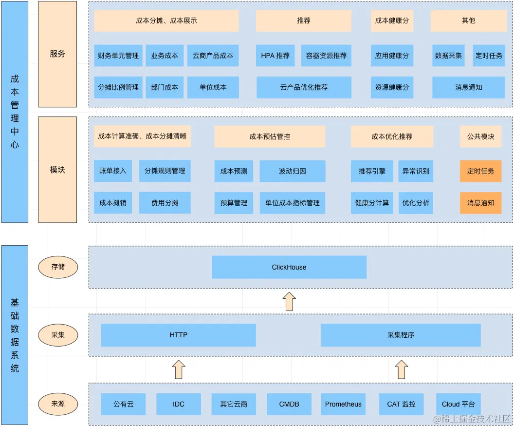 做基础设施的同学应该都熟知这个系统,在做成本分摊之前需要进行做的首要事情是基础设施数据的提供。我们自研、打造了CMDB系统,涵盖了各种云资源、业务服务管理。以应用为中心,把组织架构部门/业务域、人、应用、资源关系串了起来。这样成本平台就能通过对接cmdb获取到所有相关的数据,将成本按照实例级维度分摊到业务域、对应到团队、部门,支持日、月维度成本数据分析和成本预测。