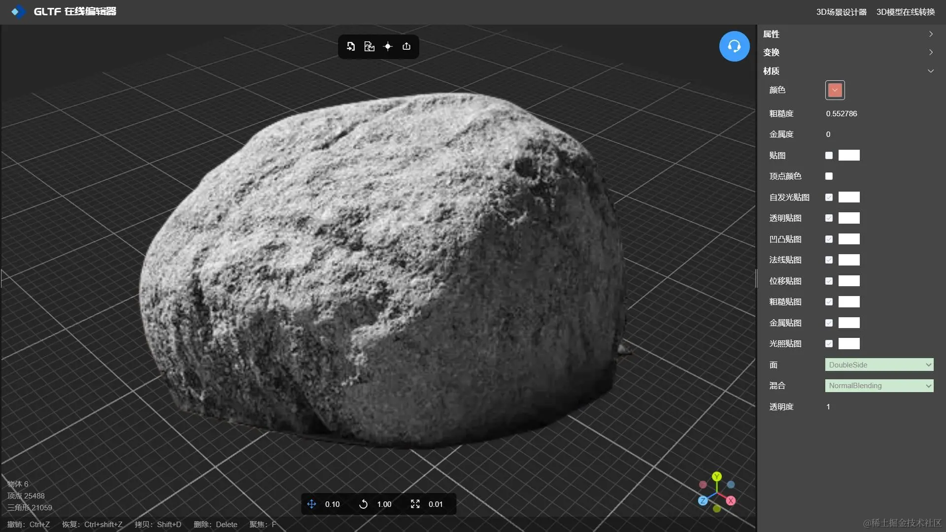 GLTF 编辑器 -NSDT 不仅可以设置3D模型纹理贴图,还可以设置模型的几何原点、以及对有相同材质属性的mesh进行合并,实现模型轻量化,是一款不可多得的实用型在线模型编辑工具。