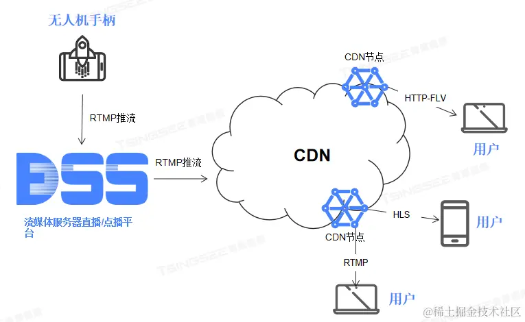 通过以上方案我们可以看到,无人机将视频流传给操作手柄,手柄通过RTMP推流给公网流媒体服务器EasyDSS平台后,进行视频的分发,输出RTSP、RTMP、HLS、HTTP-FLV、Websocket-Flv、Webrtc等格式的直播流,进行全终端直播。当用户较多需要大并发时,还支持通过RTMP转推方式,将视频流推送给公网CDN进行节点分发。
