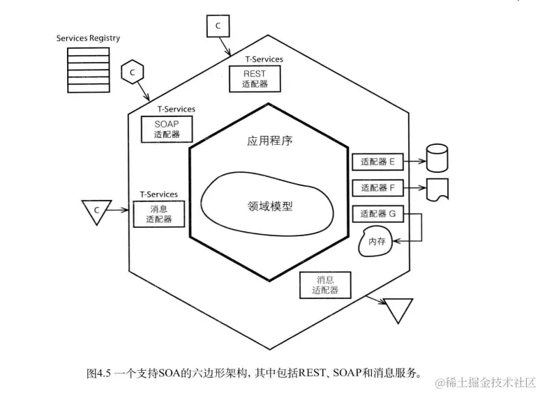 六边形架构的功能如此强大,以以致于它可以用来支持系统中的其他架构。比如,我们可能采用SOA架构、REST或者事件驱动架构;也有可能采用CQRS;或者数据网织或基于网格的分布式缓存;还有可能采用Map- Reduce这种分布式并行处理方式。