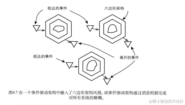 在六边形架构中,端口—适配器的消息处理组件将简单地将任务分发给应用服务(或命令处理器),之后应用服务加载目标聚合,再调用聚合上的方法。同样,聚合也会发出领域事件,该事件表明聚合已经完成了。