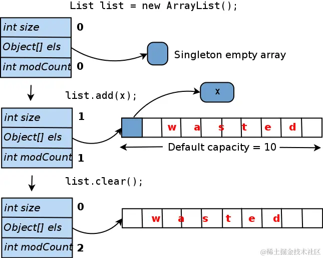 当您ArrayList使用默认构造函数创建一个时,即invoke new ArrayList(), elementData 被设置为指向单例共享的零大小数组(elementData也可以设置为null,但是单例数组提供了一些次要的实现优势)。将第一个元素添加到列表后,将elementData 创建一个真实的唯一数组,并将所提供的对象插入其中。为避免每次添加新元素时都调整数组大小,将以长度10(“默认容量”)创建该元素。这里有一个陷阱:如果您从不向此添加更多元素ArrayList,则elementData 阵列中10个插槽中的9个将保持为空。即使以后清除此列表,内部阵列也不会缩小。下图总结了这个生命周期: