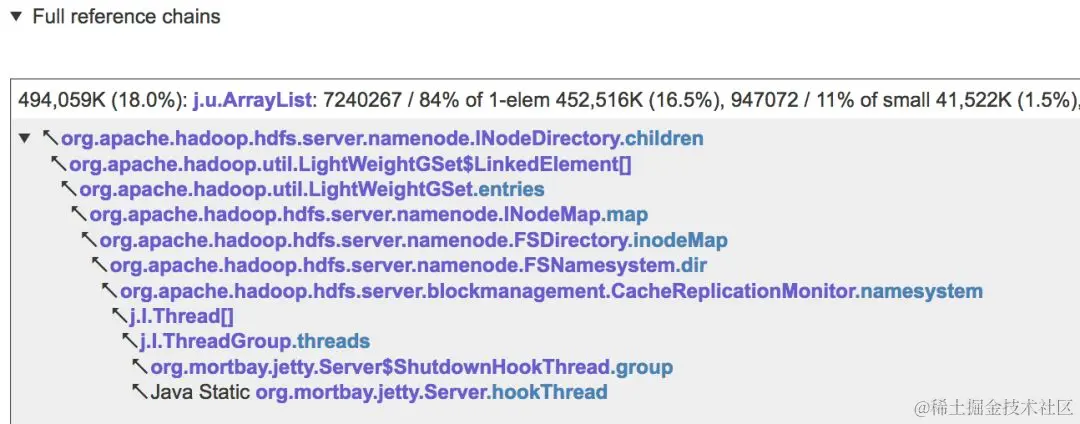 知道哪些引用链和/或单个数据字段(例如,INodeDirectory.children上面的数据)指向浪费大多数内存的集合,可以使您快速而精确地找出导致问题的代码,然后进行必要的更改。