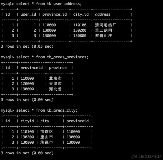 首先创建一个三个的表用于测试,同一数据节点内的多表查询,tb_areas_provinces, tb_areas_city, tb_user_address 三个表都是在dn3数据节点上的。