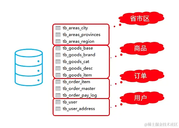 说明1:整个业务系统中的表,大致分为四个,商品信息类的表,订单相关的表,用户相关表及省市区相关的表,这里暂时将省市区的表和用户相关的表放在一个数据节点上。
