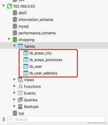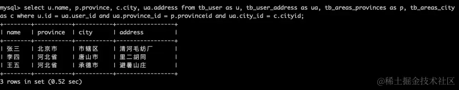 现多表查询需求是:根据tb_user, tb_user_address表,tb_areas_provinces表和tb_areas_city表查出用户的名字已经所在的省,市,已经详细的地址:使用Mycat查询