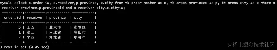 select o.order_id, o.receiver,p.province, c.city from tb_order_master as o, tb_areas_provinces as p, tb_areas_city as c where o.receive_province=p.provinceid and o.receiver_city=c.cityid;