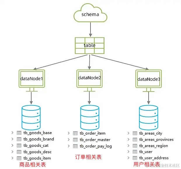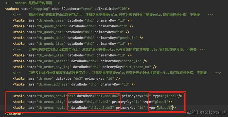 说明2:在table标签中,商品相关的表都放在dn1数据节点上,和订单相关的表都放在dn2数据节点上,和用户和地址相关的都放在dn3数据节点上