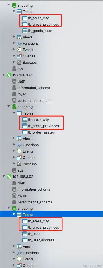 说明5:这时候就会发现tb_areas_procinces和tb_areas_city出现在了三个数据节点上