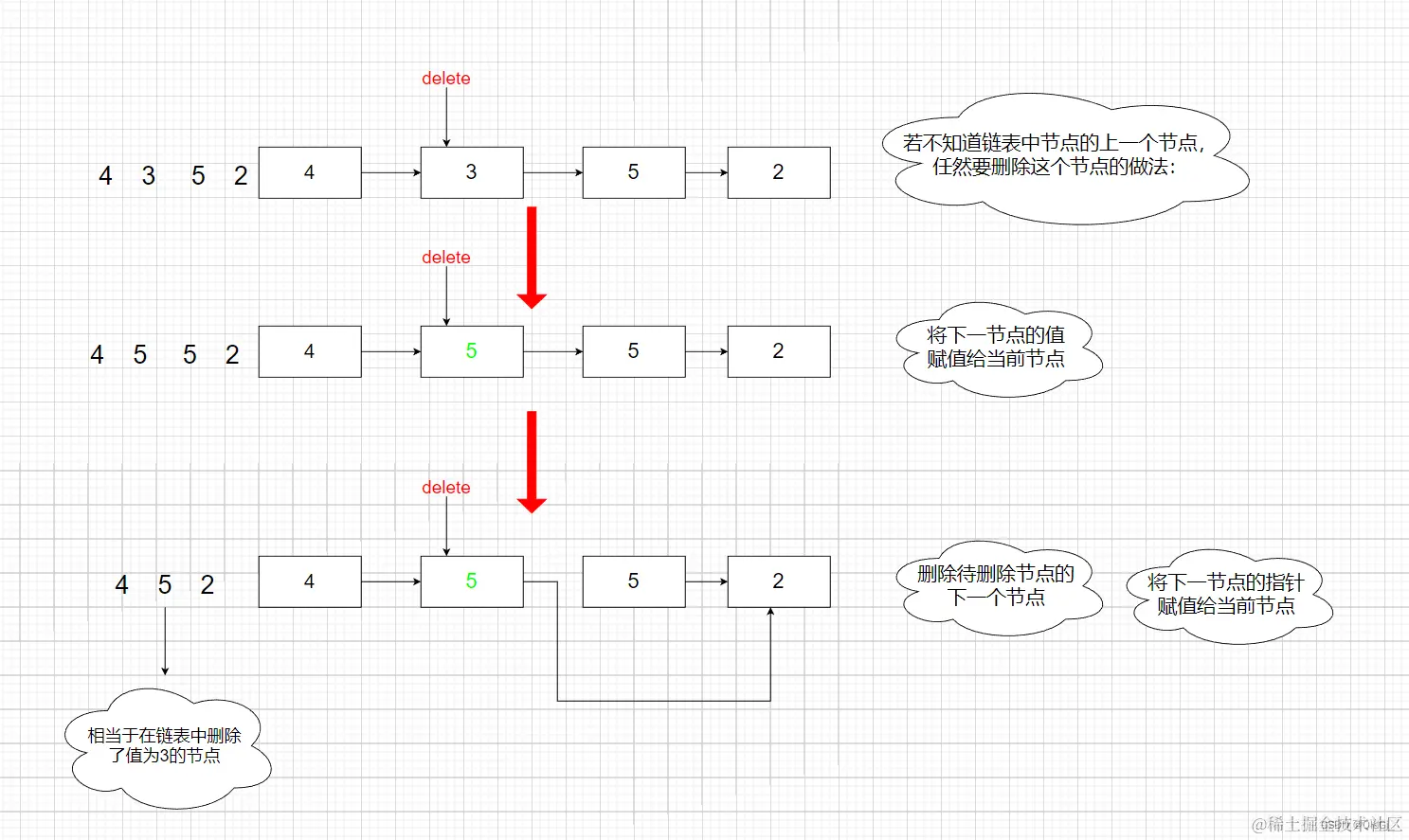 node.next的节点值即可。例如,给定链表4→5→1→9,要被删除的节点是5,即链表中的第2个节点。可以 通过如下两步操作实现删除节点的操作。 1.将第2个节点的值修改为第3个节点的值,即将节点5的值修改为1,此时链表如 下: 4→1→1→9 2.删除第3个节点,此时链表如下: 4→1→9 达到删除节点5的效果。
