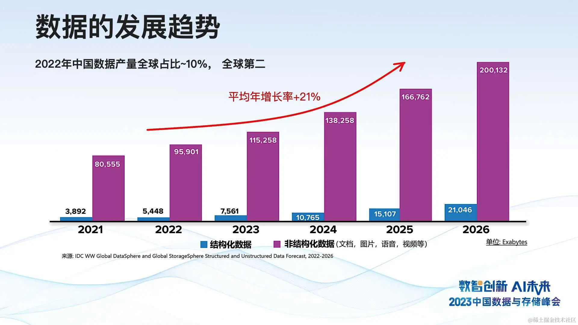 这张图描述了未来几年全球数据发展的趋势,来源于 IDC 的统计和预测报告,蓝色代表结构化数据的总产量,紫色代表非结构化数据的总产量。从这个图中我们可以看到,今后几年全球数据总产量年增长率在 21%左右,这远超过 GDP 的增长,而且绝大部分是非结构化的数据,比如说文档、图片、语音、视频等等。中国数据产量在全球居于第二位,而且增长率也很高。对于企业来说,这意味着我们需要更好的技术和方法来挖掘海量而且多模态的数据。