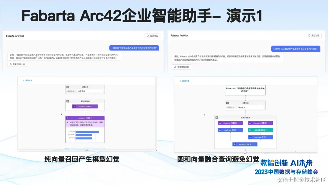 首先,我想演示的是我们如何利用图和向量的融合,来避免一些大型模型可能出现的幻觉问题。在上图左侧,如果仅使用向量召回的方法,假设我们提出一个问题,比如询问我们的 Fabarta v2.0 数据库是否包含区块链相关的功能。使用纯向量召回的方式,它可能会错误地回答说我们支持区块链相关的功能。这是因为在我们的代码库中存在一些关键字,例如 'block'等词汇,并且这些关键字可能导致大型模型产生幻觉,使其认为我们有这样的功能。