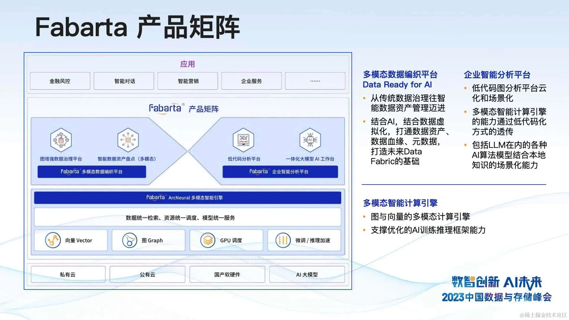 我们作为一家 AI 数据基础设施公司,提供以数据为中心的 LLM 架构(Data-Centric LLM),通过图和向量融合的多模态智能引擎及低代码企业智能分析平台的复合产品,结合包括大模型在内的各种智能化技术,助力企业实现创新驱动的转型升级。Fabarta 构建以数据为中心的智能化应用架构,通过打造坚实的智能化时代数据基础设施,助力企业在智能化应用方面的创新落地。