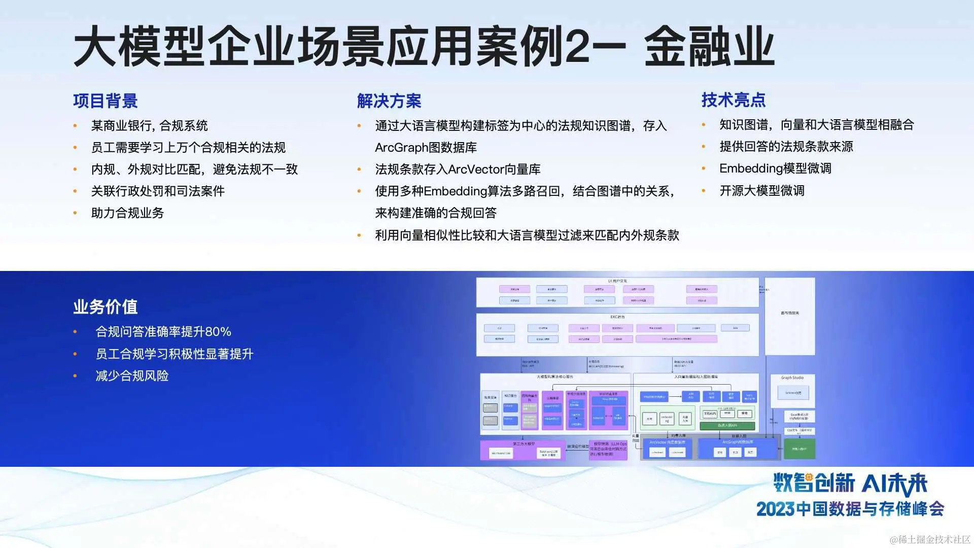 另外,我们通过向量的相似性比较和大型模型的过滤,成功地实现了内外部规定的匹配。我们的解决方案显著提高了合规问答的准确率,至少比之前的老系统提高了 80%以上。 这种准确率提升也激发了员工对合规学习的积极性,进而降低了银行合规方面的风险。