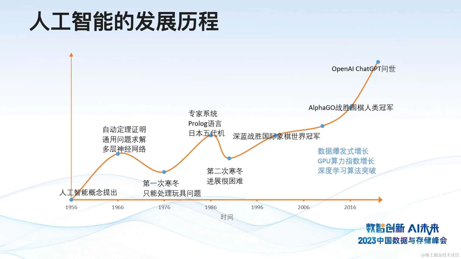 我们再看目前人工智能相关的概念,这张图是人工智能将近 70 年的发展历程,先后经历了两次高峰和两次寒冬。自 1956 年人工智能概念在达特茅斯的技术会议上首次提出以来,该领域迅速蓬勃发展。当时人们普遍认为计算机可以解决人类所有问题,并出现了多层级神经网络架构。然而,十几年后,人们发现人工智能的能力实际上非常有限,可能只能解决一些非常简单的玩具问题。因此,当时的人工智能在互联网时代遭遇了第一次寒冬期。