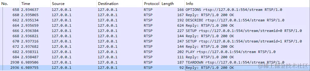 话不多说,我们直接在上面的推流环境下(由于EasyDarwin似乎加密了某些信息,我们选择了一个其他的RTSP服务器,效果是一样的),用VLC收流,并用wireshark抓包看看协议流程是不是这样的: