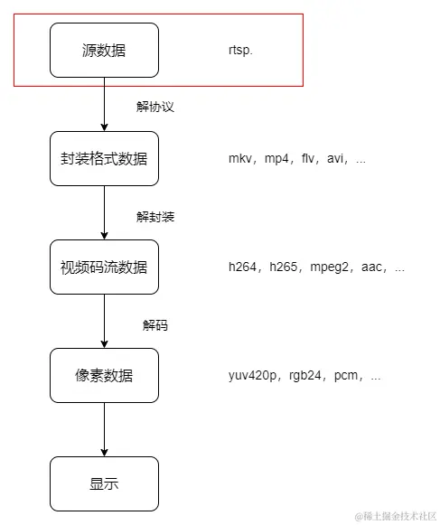 用FFmpeg接收RTSP流并播放的流程和播放mp4文件的流程差不多,只不过播放mp4文件时,文件作为播放源,而接收RTSP流时,RTSP流作为了播放源: