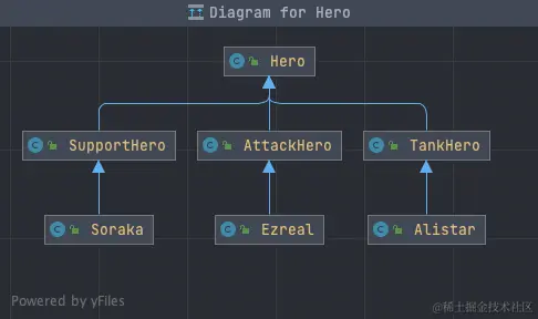 // 英雄基类 public class Hero { } // 坦克英雄的抽象 public class TankHero extends Hero { } // 输出英雄的抽象 public class AttackHero extends Hero { } // 辅助英雄的抽象 public class SupportHero extends Hero { } // 坦克英雄 public class Alistar extends TankHero { } // 输出英雄 public class Ezreal extends AttackHero { } // 辅助英雄 public class Soraka extends SupportHero { }