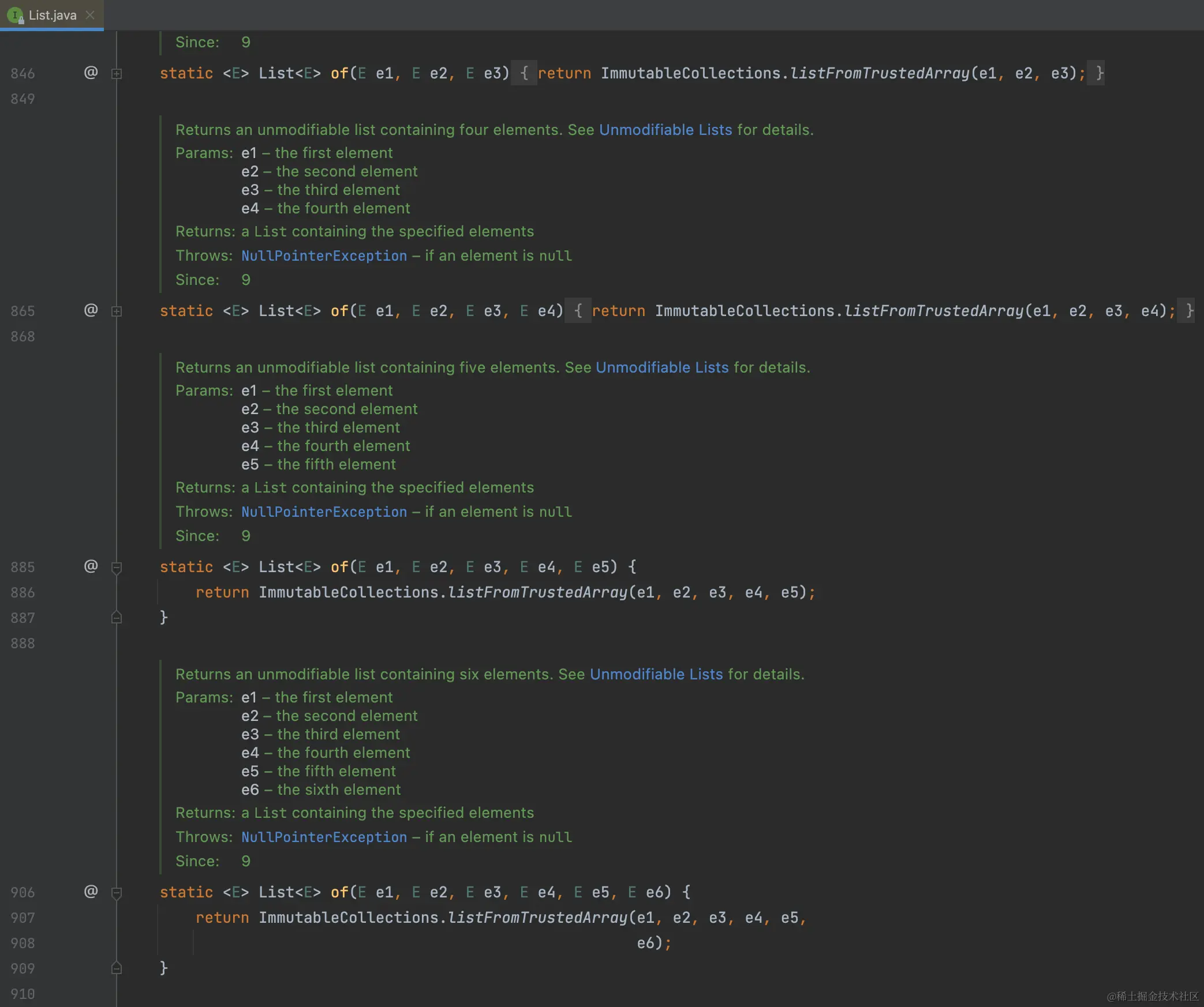 查看List接口的of方法,发现JDK是通过将of方法重载了若干次以达到快速填充对象的效果,List、Map、Set通过这种方式均至多能够一次性填充10个元素。