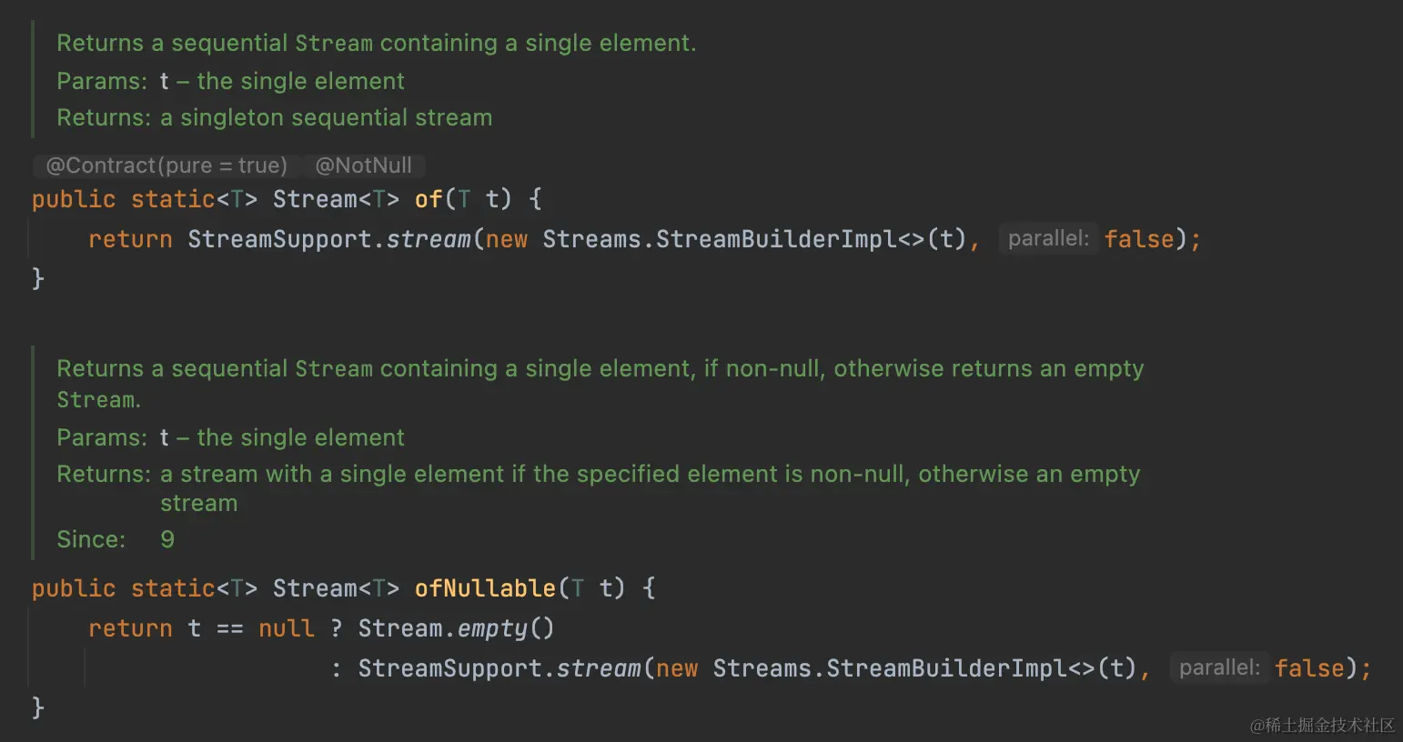 而JDK9中提供了Stream.ofNullable方法,可以对null对象进行过滤,返回空stream。