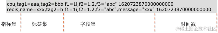 当您手动输入样本数据时,日志数据可在样本解析测试中直接输入 message 内容进行测试。但其他数据类型需要先将内容转换成“行协议”格式,示例如下图所示: