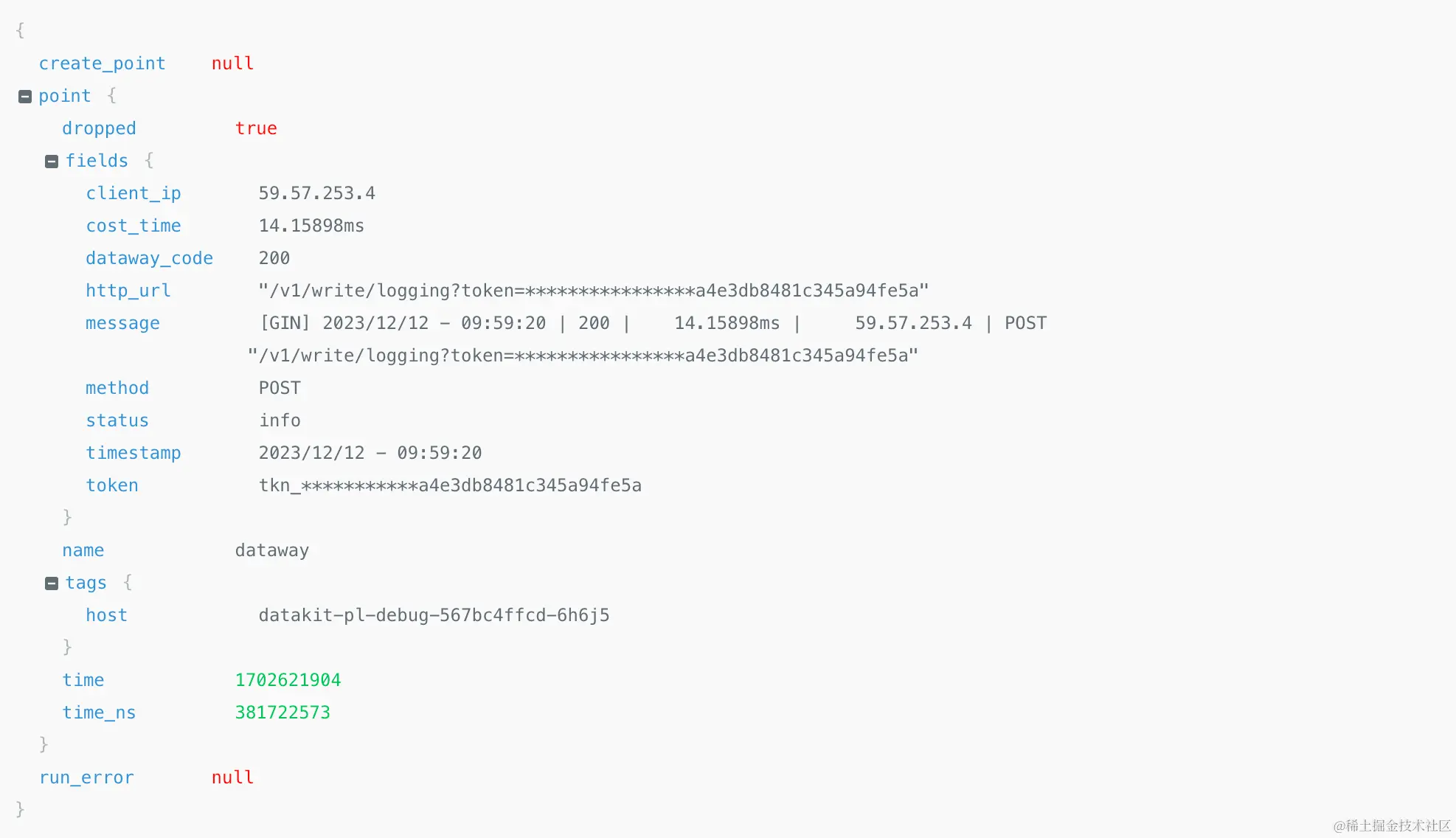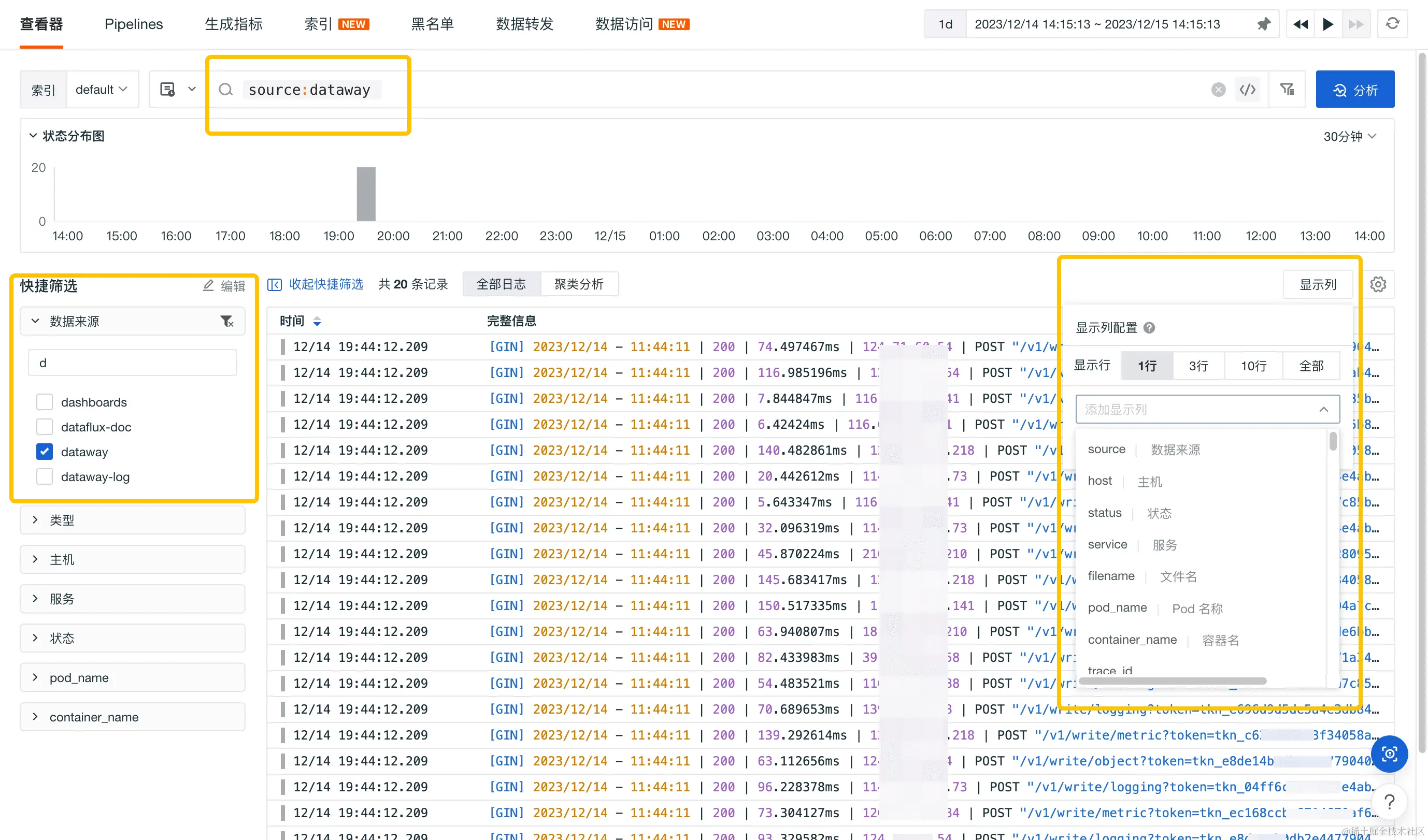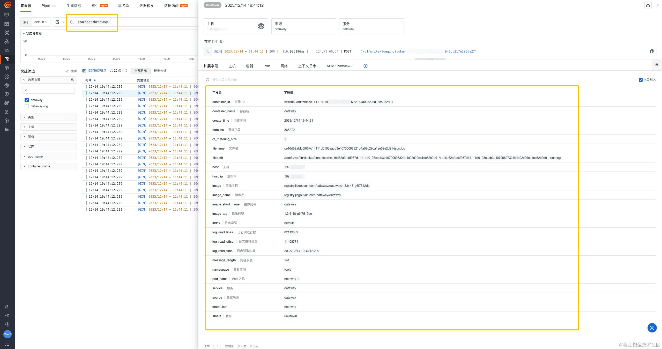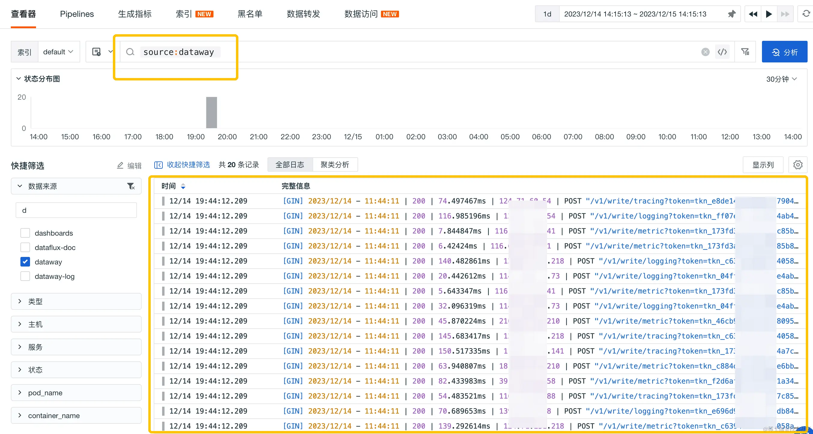 开启日志采集器后,我们就可以在观测云查看和分析 Dataway 日志,确定需要日志切割出的字段,如日志产生的时间、日志的生成地址、日志状态以及日志的内容等。