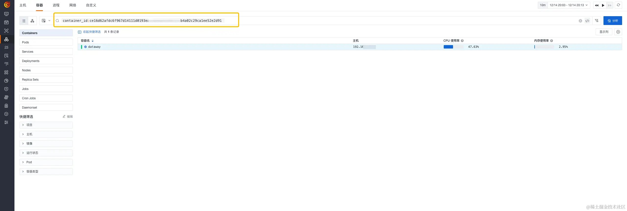 另外,生成的字段可以作为属性字段帮助您与其他模块进行联动,例如,利用上图中的 container_id 在基础设施 > 容器查看器中搜索该容器的相关数据并进行联动分析,帮助我们快速排障并解决。