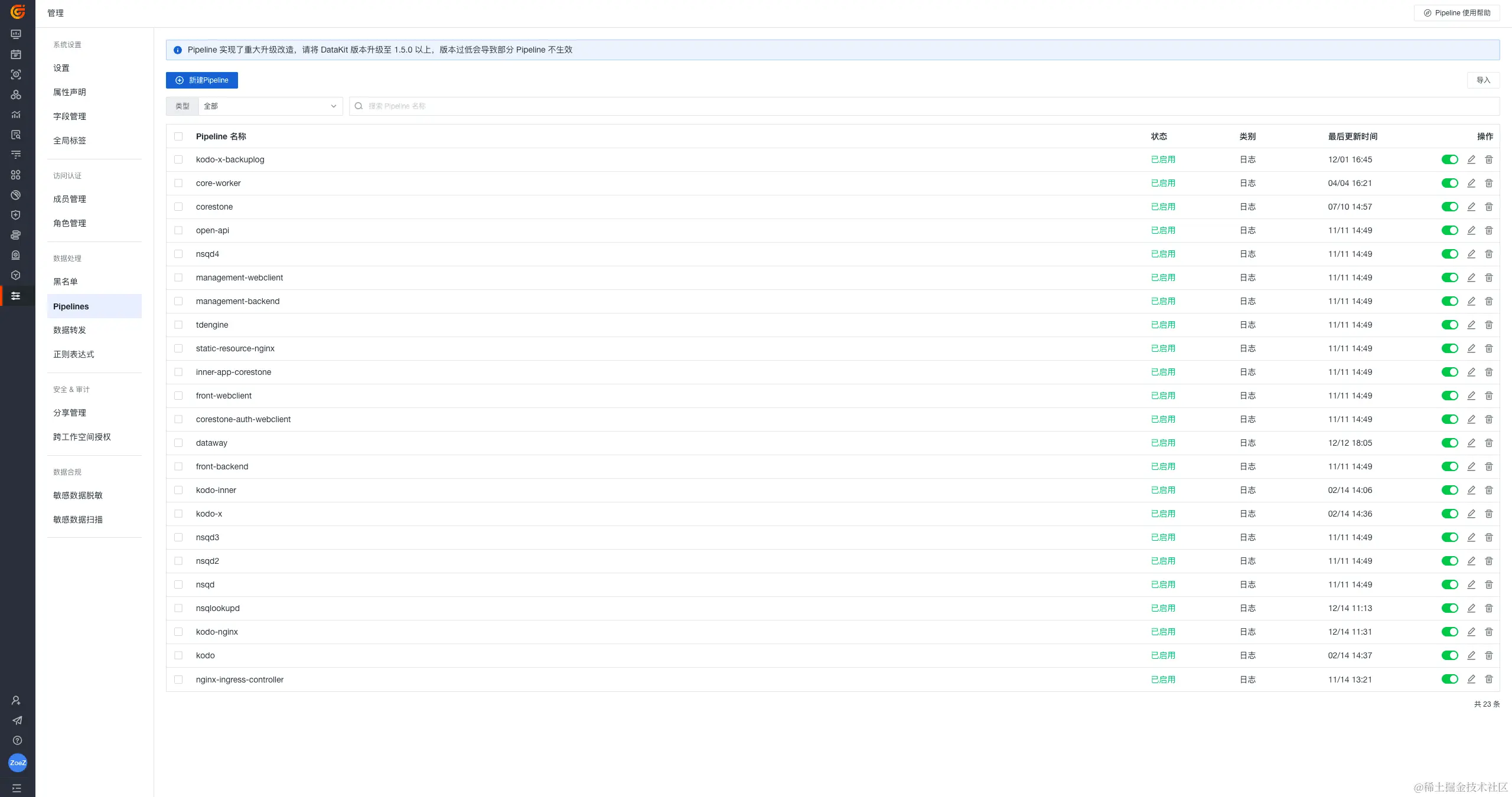 当然,您也可以在管理 > Pipelines 统一管理所有 Pipeline 文件,进行批量导出、删除等操作,提高工作效率。