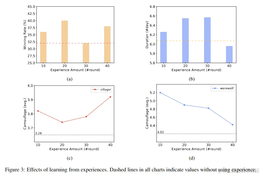 在实验中,游戏进行了 50 轮。结果显示,从经验中学习可能会提高平民方的胜率。当使用 10 或 20 轮的历史经验时,对平民方的胜率和游戏持续时间都有显著的积极影响,证明了方法的有效性。然而,在从 40 轮经验中学习时,虽然平民方的胜率稍有提高,但平均持续时间却缩短。