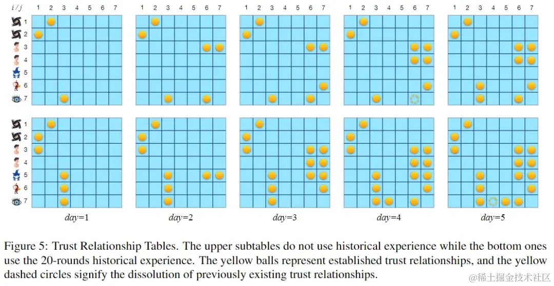 上图展示了两个信任关系表。上表对应未使用经验池的回合,下表对应使用由 20 回合游戏构建的经验池的回合。两轮比赛持续时间均为 5 夜。在利用 20 轮历史经验时,大语言模型似乎更倾向于建立信任关系,尤其是双向信任。