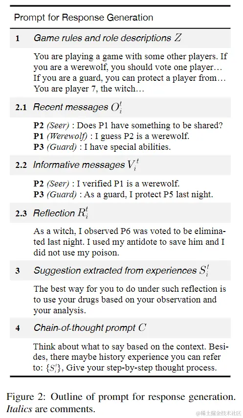 在本次实验中,研究人员设置了 7 名玩家,分别扮演 5 种不同的角色——2 名狼人、2 名平民、1 名女巫、1 名守卫和 1 名预言家。每个角色都是通过 prompt 生成的独立 Agent。下图展示了响应生成 Prompt 的框架,由四个主要部分组成: